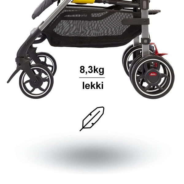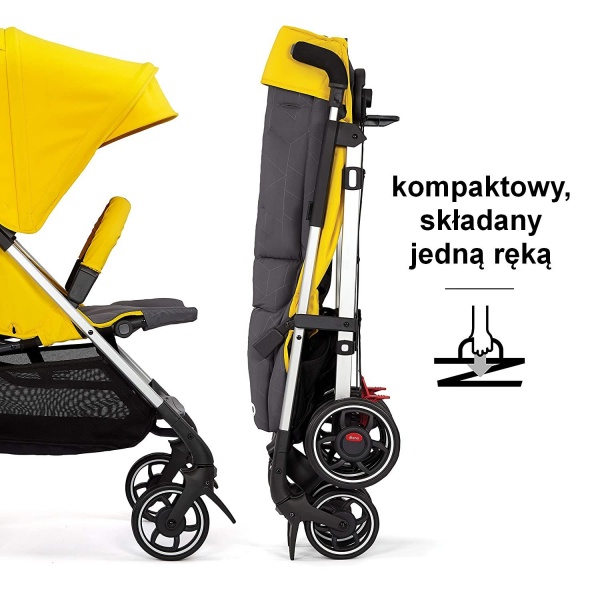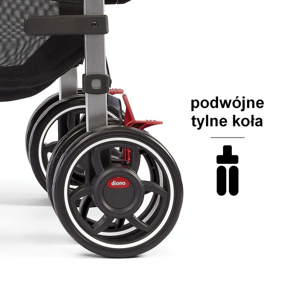 - PODWÓJNE TYLNE KOŁA – Podwójne tylne koła pomogą w prowadzeniu wózka przez zatłoczone miejskie chodniki.
