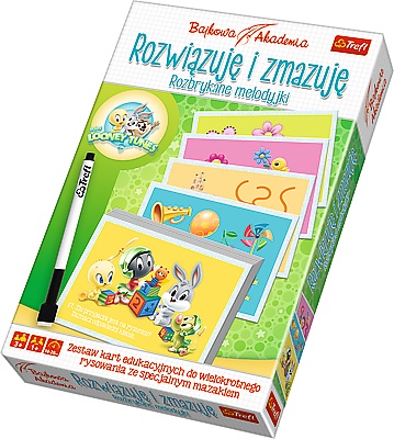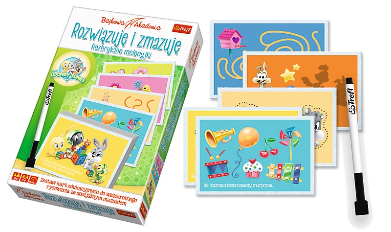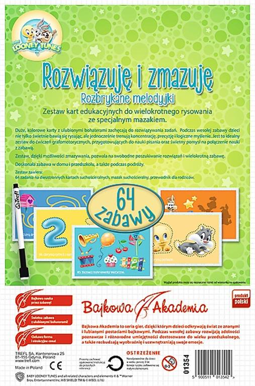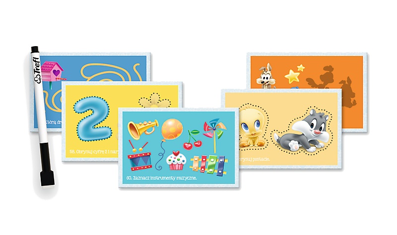 Zestaw kart edukacyjnych bohaterami bajki „Looney Tunes” do wielokrotnego rysowania ze specjalnym mazakiem. Duże, kolorowe karty z ulubionymi bohaterami zachęcają do rozwiązywania zadań. Podczas wesołej zabawy dzieci nie tylko świetnie bawią się, rysując ale jednocześnie trenują koncentrację, precyzję i logiczne myślenie. Karty są idealnym zestawem do ćwiczeń grafomotorycznych, przygotowujących do nauki pisania.
